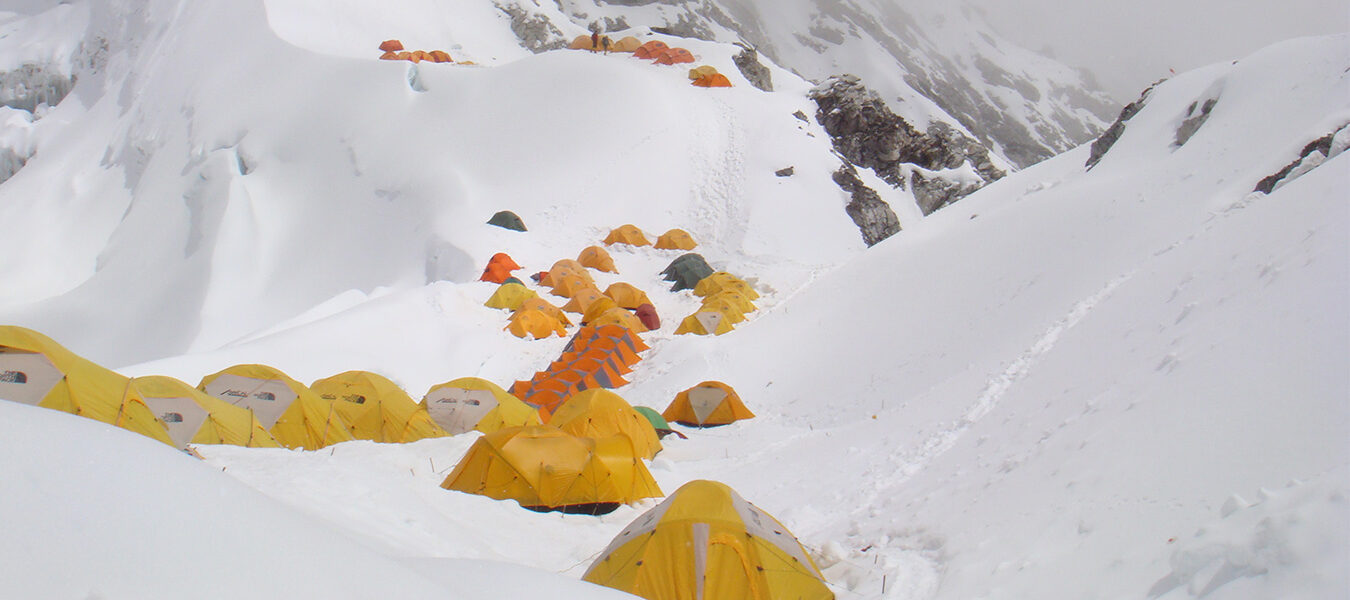 • Camp 2 - 7,000m: Follow snow ridge to series of ice cliffs and involves steep 50m ice wall at 6600m. Though straight forward it is hardest climbing in the route. Above the ice cliffs, there are several crevasses giving access to Camp 2 at 7,000m.